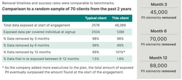 Специалистам удалось удалить из интернета 97% PII сотрудников в течение 8 недель с начала кампании — это больше 88 000 вхождений. К ним относятся адреса, имена и фамилии, номера телефонов и даты рождения — все то, что могли использовать хакеры. Оставшиеся 2,26% ожидали удаления на момент публикации, и лишь 0,18% PII не подлежали удалению.