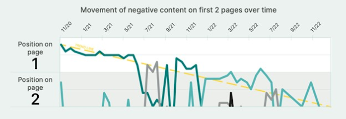 Специалисты использовали диверсифицированные методы управления репутацией, включая положительные публикации и отработку отрицательных отзывов. Этот конфликт длился несколько лет, и значимого эффекта удалось достичь спустя 8 месяцев с начала кампании. Несмотря на появление новых материалов, через 14 месяцев первая страница Google содержала только положительный контент.