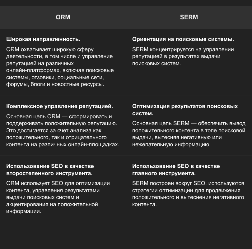 SERM — «грубая сила» в модерации поисковых систем. ORM — точечный инструмент в работе с клиентами.