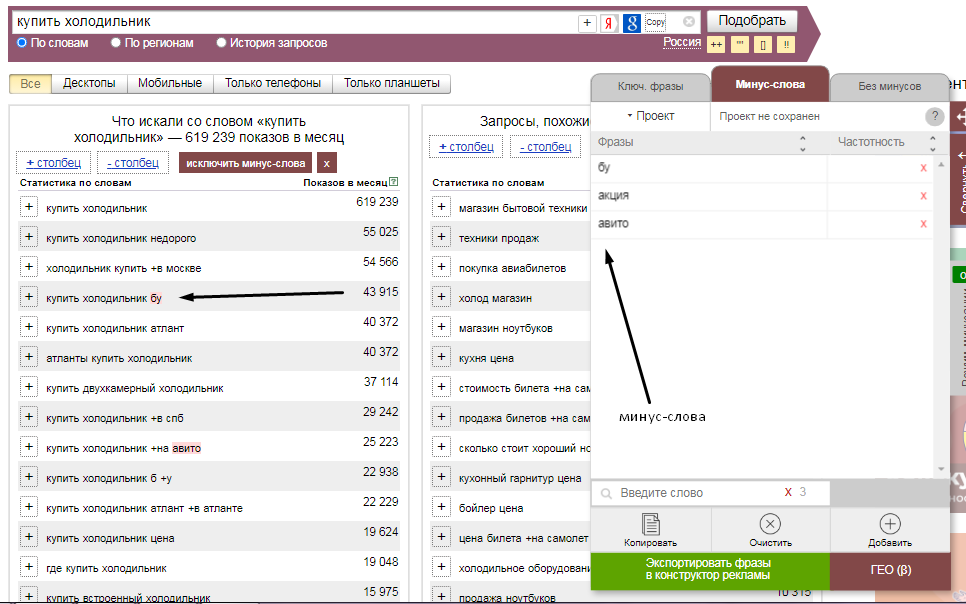 В процессе сбора ключевых слов можно встретить те, которые не относятся к тематике. К примеру, в случае с продажей холодильников это могут быть следующие слова: