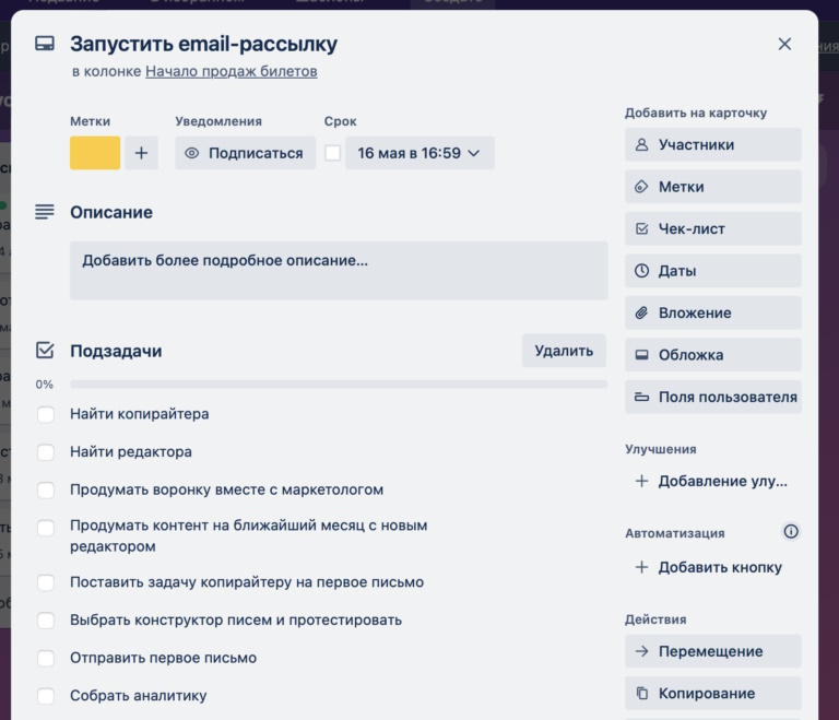 Подзадачи помогают более точно оценить, сколько времени потребуется на задачу. Если «запустить email-рассылку» звучит довольно просто, детализация поможет увидеть, что только найм сотрудников может затянуться на несколько недель.