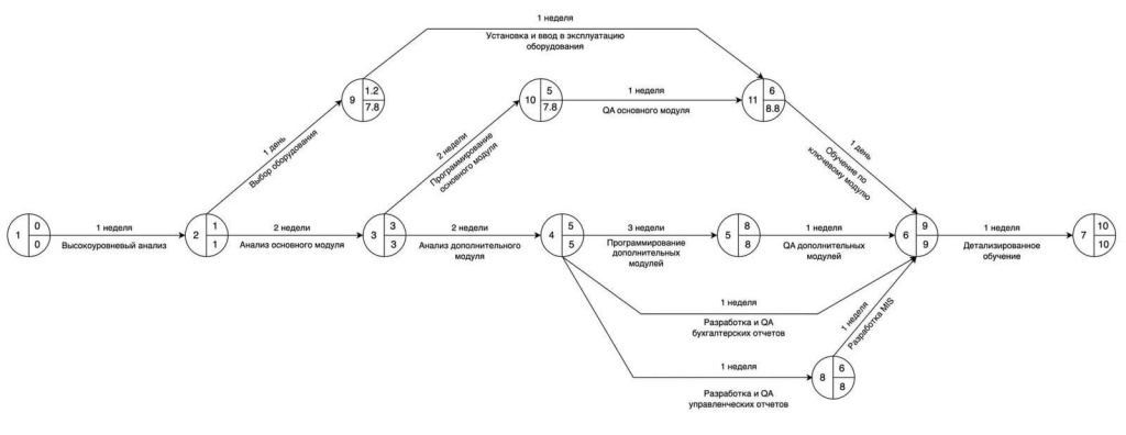 Это пример PERT-диаграммы для сложного проекта по разработке ПО. В схеме можно запутаться, но поясняют ее стрелки и цифры, которые описывают порядок действий и время исполнения.
