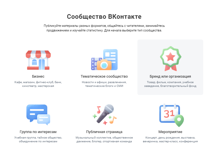 Далее вам откроется окно с возможностью выбора варианта создания группы с учетом специфики ваших целей.