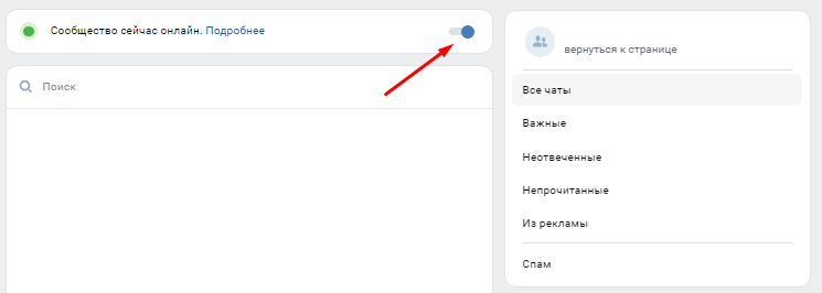 У этой функции есть еще одна хорошая черта — возможность подключения кнопки — «Сообщество онлайн. Ответят прямо сейчас». Эта кнопка находится вверху — справа и «горит» зеленым цветом.