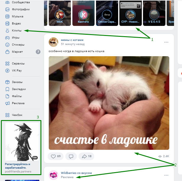 - В историях и клипах. Формат «историй» используется для коротких репортажей и «быстрого» контента. Почему именно быстрого? Истории актуальны всего сутки,затем они исчезают. При этом данный формат пользуется большой популярностью — шанс найти потенциального клиента именно среди зрителей коротких вертикальных видео весьма велик. «Клипы» также отображаются в вертикальном формате, но находятся не в основной ленте, а в специальном разделе левого меню.