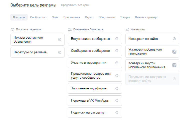 Конверсии. Доступные цели — конверсии на сайте, продвижение товаров из каталога, установки приложения, конверсии внутри приложения.