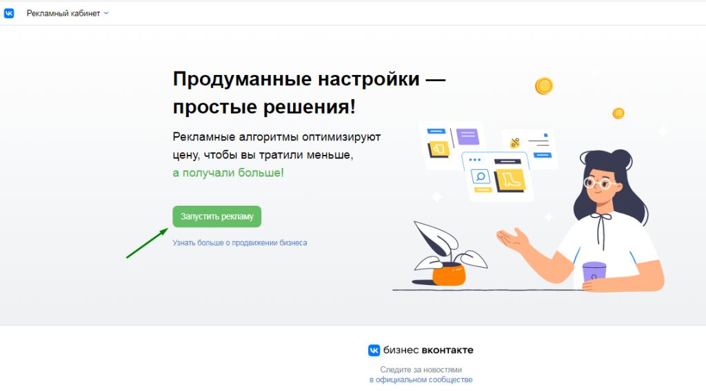 По этой ссылке заходим в свой кабинет рекламы и приступаем к созданию первого объявления, установке настроек. Для этого нужно нажать клавишу «Запустить рекламу».
