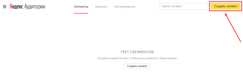 Вас перекинет на сайт Яндекс.Аудиторий. В правом верхнем углу будет кнопка “Создать сегмент”, с её помощью можно добавить сегмент в Яндекс.Аудитории, который затем можно будет использовать для ретаргетинга в Яндекс.Директе.