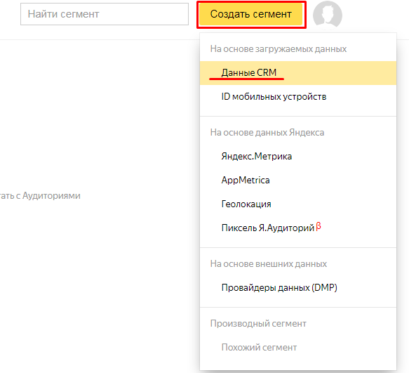 После клика на “Создать сегмент” выберите “Данные CRM” (в зависимости от ваших потребностей вы можете выбрать любой другой пункт, и создать тот сегмент, который нужен для решения ваших задач).
